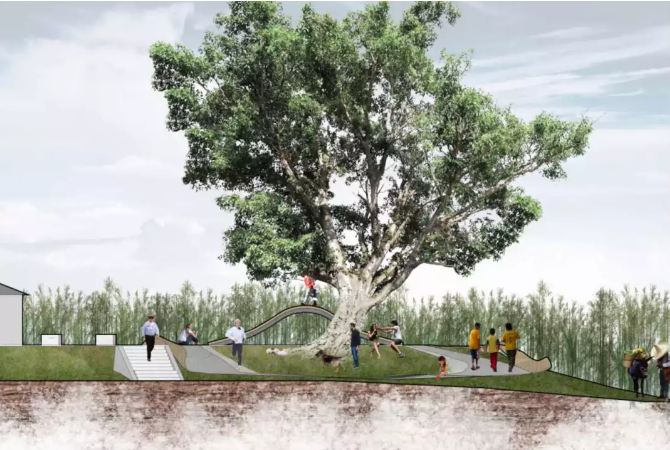 天津大学:“夏木塘之舞”围绕村中古树布局,以起伏的环形平台呈现,营造围绕神树活动的场所,体现四种趣味:欢聚之趣,人们围绕大树聚会,形成交流场所;嬉闹之趣,人们在圆环 ... ...