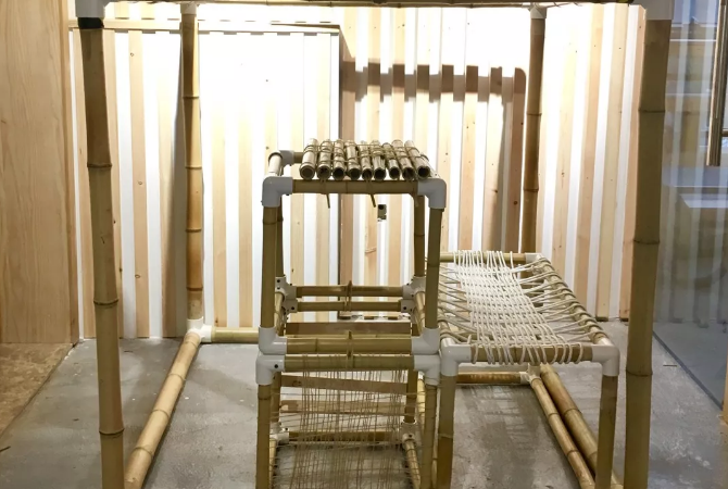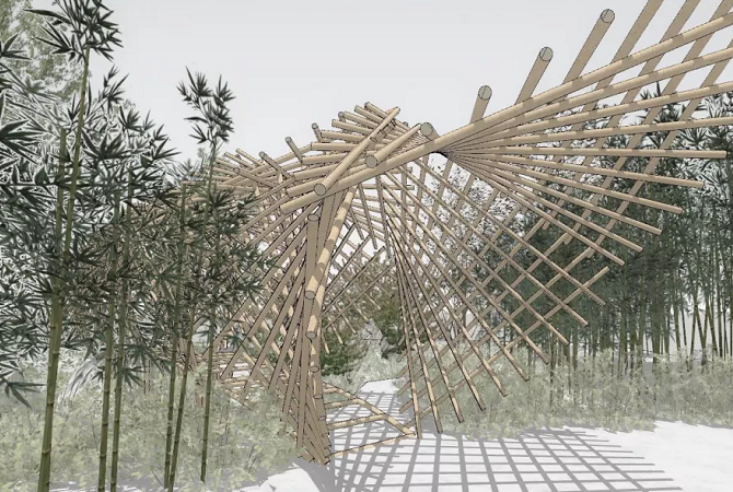 华南理工大学:连接趣村村口湖面两岸的桥,充分利用了原竹的材料特性,结合新型环氧树脂节点设计,通过巧妙的轻型整体张拉结构体系,营造出力学结构的独特视觉张力,竹子与芦苇 .. ...