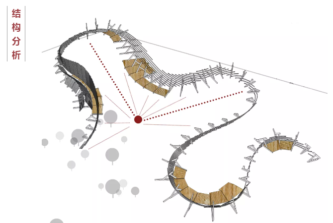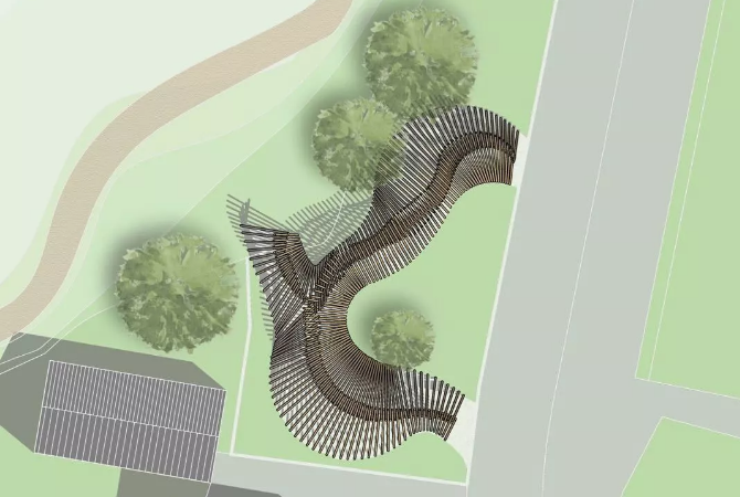 哈尔滨工业大学:方案位于一片背靠村庄、面朝稻田的树林里,设计如流水般穿梭于林间,曲线的钢结构加长度不等的木铺板及高低起伏的木背板提供给游人与村民游乐聚会的围合空间 ... ...